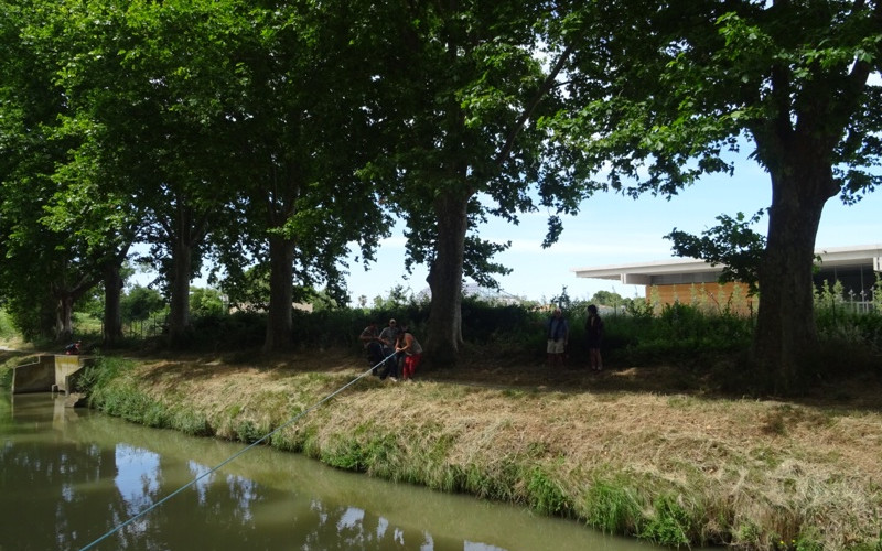 Onwards to the next adventure! We neeeded to turn around but it was too narrow so we went on further and chose a spot to turn around. Alas it wasn’t as big as we thought and we got stuck at right angles. While Phillip and Malcolm were trying to pull the boat around with Alison at the helm, some (younger) people came along and offered to help We were apparently very near a temporary camp and after a few whistles reinforcements arrived.