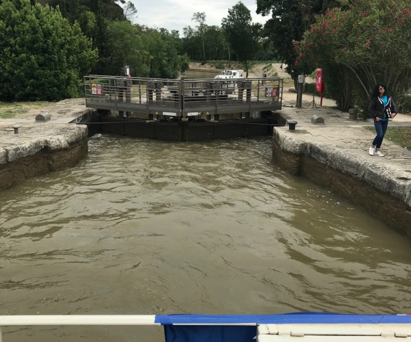 Disaster struck at the lock at Puichric We headed towards the lock but lost power yet again, but this time it was the reverse which had failed at the worst possible moment and we also lost the steering so went crashing into the wall beside the lock entrance quite hard - no human casualties but some of the chattels on the boat didn’t fare as well. The wall of the lock didn’t appear to have any lasting effects but the boat is a little more snub nosed than before.